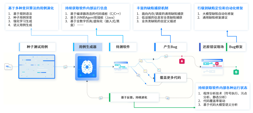 智能模糊测试是一种在程序动态运行时挖掘未知缺陷的技术,通过插桩反馈结合AI模型自动变异测试用例,实现对缺陷的快速发现和精准定位,这一在世界范围内热门与先进的自动化测试技术,可以有效保障软件安全性和稳定性、大幅提升开发测试效率。模糊测试已被全球互联网头部企业大量应用并取得良好效果,国内外多项行业标准和规范也都提出需进行模糊测试。