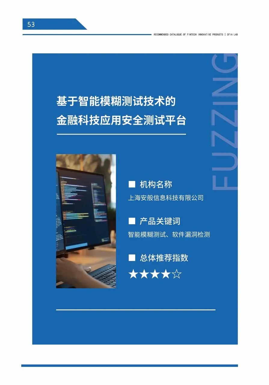 3月28日,金融科技产业联盟创新监管联合实验室正式发布了第一期《金融科技创新产品推荐目录》。安般科技「基于智能模糊测试技术的金融科技应用安全测试平台」凭借其显著的创新性和应用价值,成功入选“金融科技创新产品·技术保障篇”,充分证明了安般科技在智能模糊测试领域的领先地位,以及该测试平台对保障金融软件安全的重要意义。