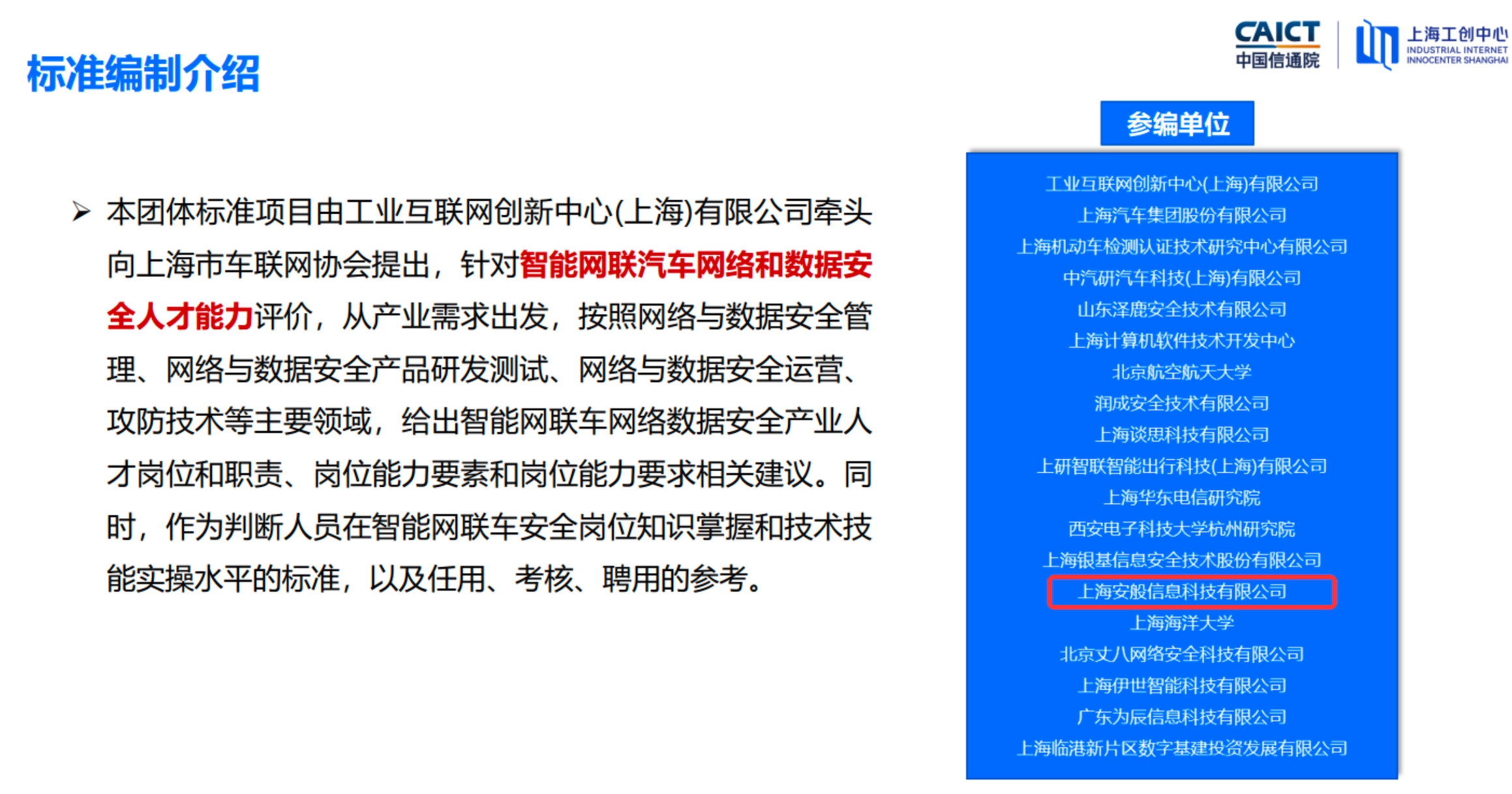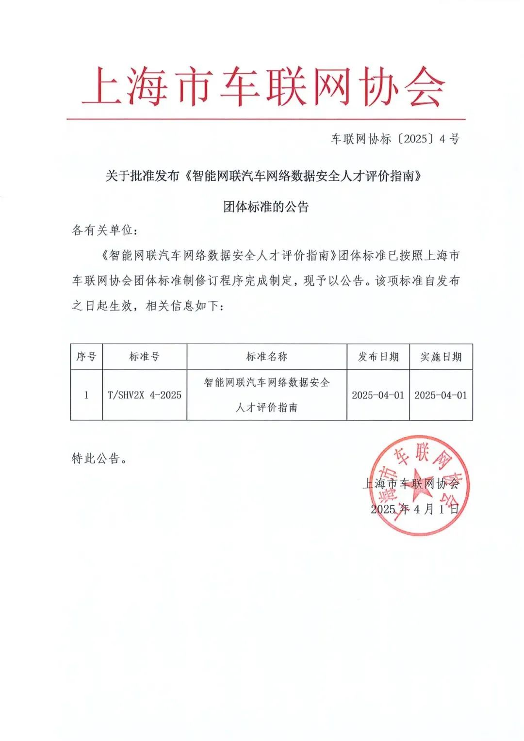 2025年4月1日,由中国信通院上海工创中心牵头起草,上海汽车集团股份有限公司、上海机动车检测认证技术研究中心有限公司、中汽研汽车科技(上海)有限公司、上海安般信息科技有限公司等单位参与起草的T/SHV2X 4—2025《智能网联汽车网络数据安全人才评价指南》团体标准正式发布并实施。